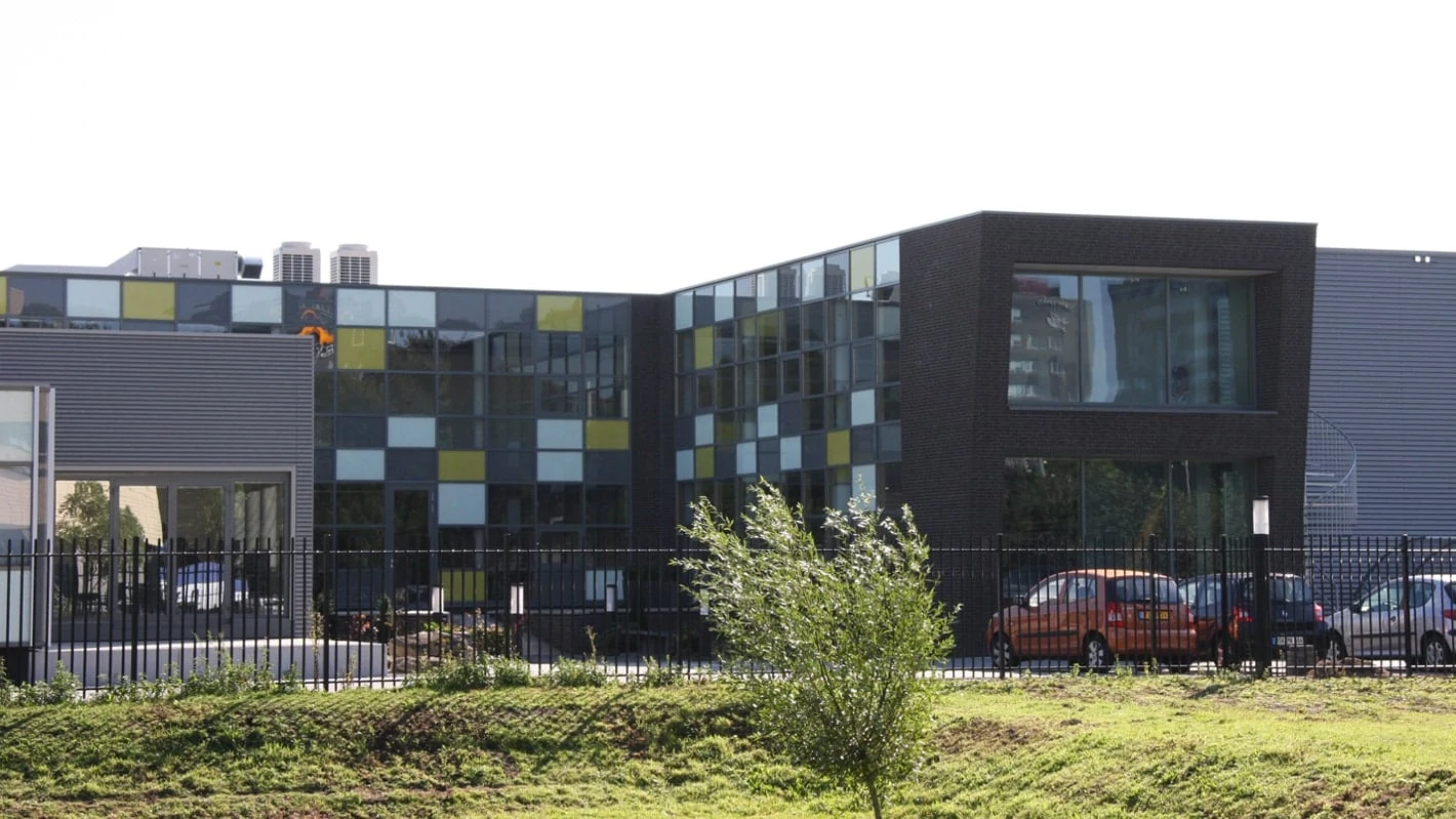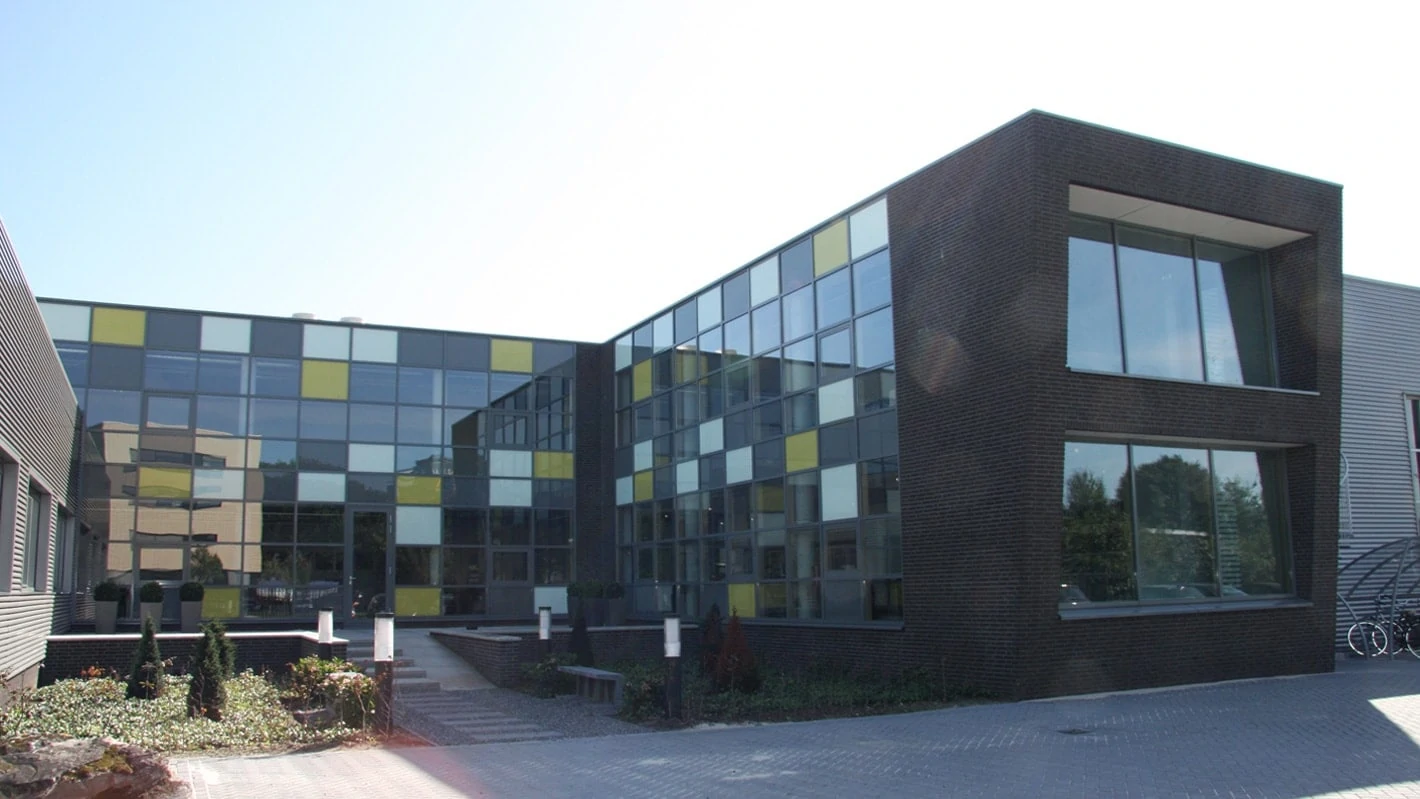 De nieuwe glazen gevels in verschillende kleuren geven het gebouw de uitstraling die past bij een eigentijds mode- en schoenenbedrijf.